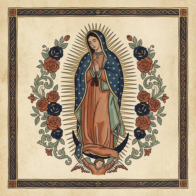Juan Diego filled his tilma (a rough cactus-fiber cloak) with Castilian roses and brought them to the bishop. When he opened the tilma, the roses fell to the floor — and there, imprinted on the fabric, was the image of Our Lady.
